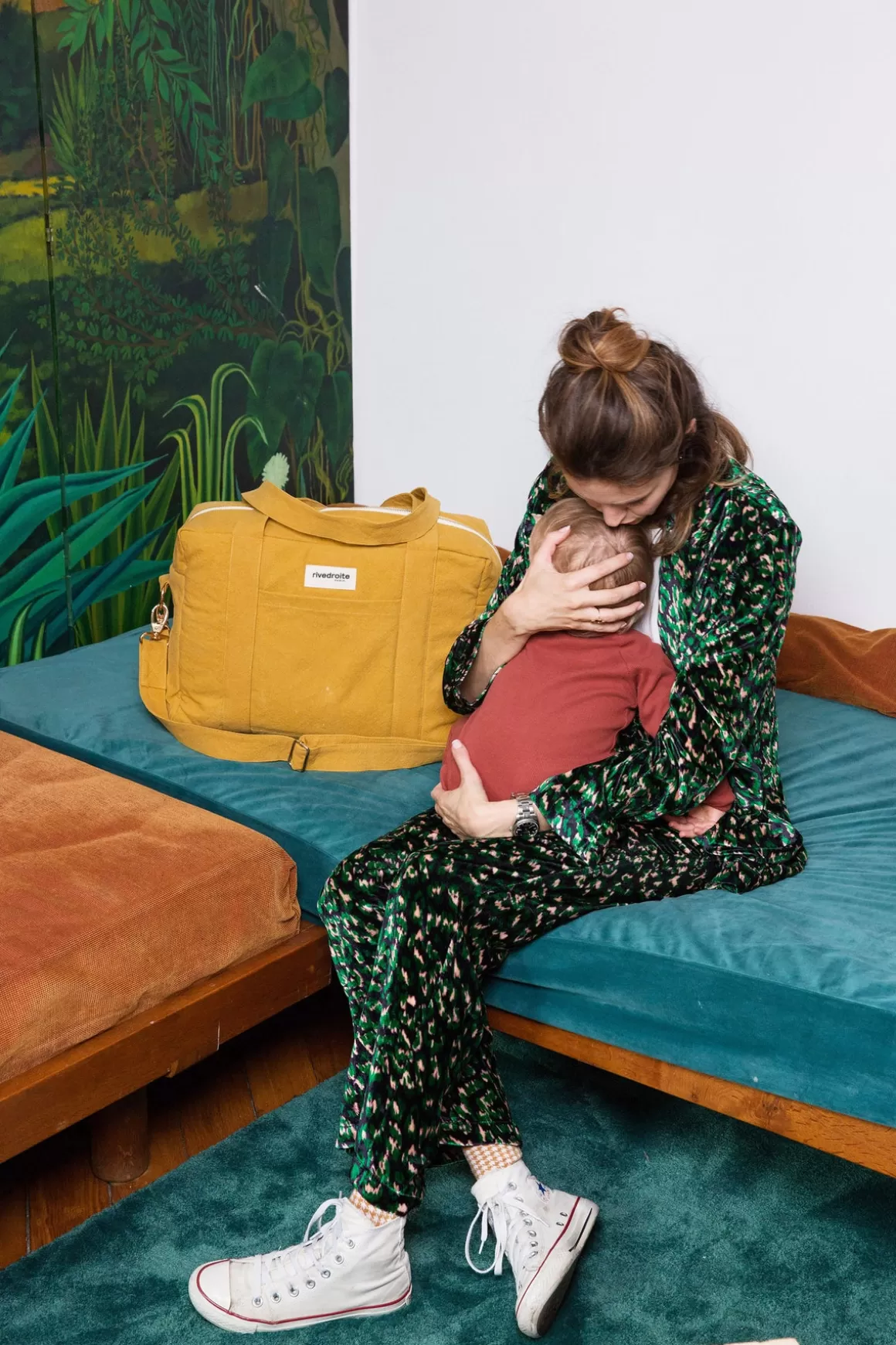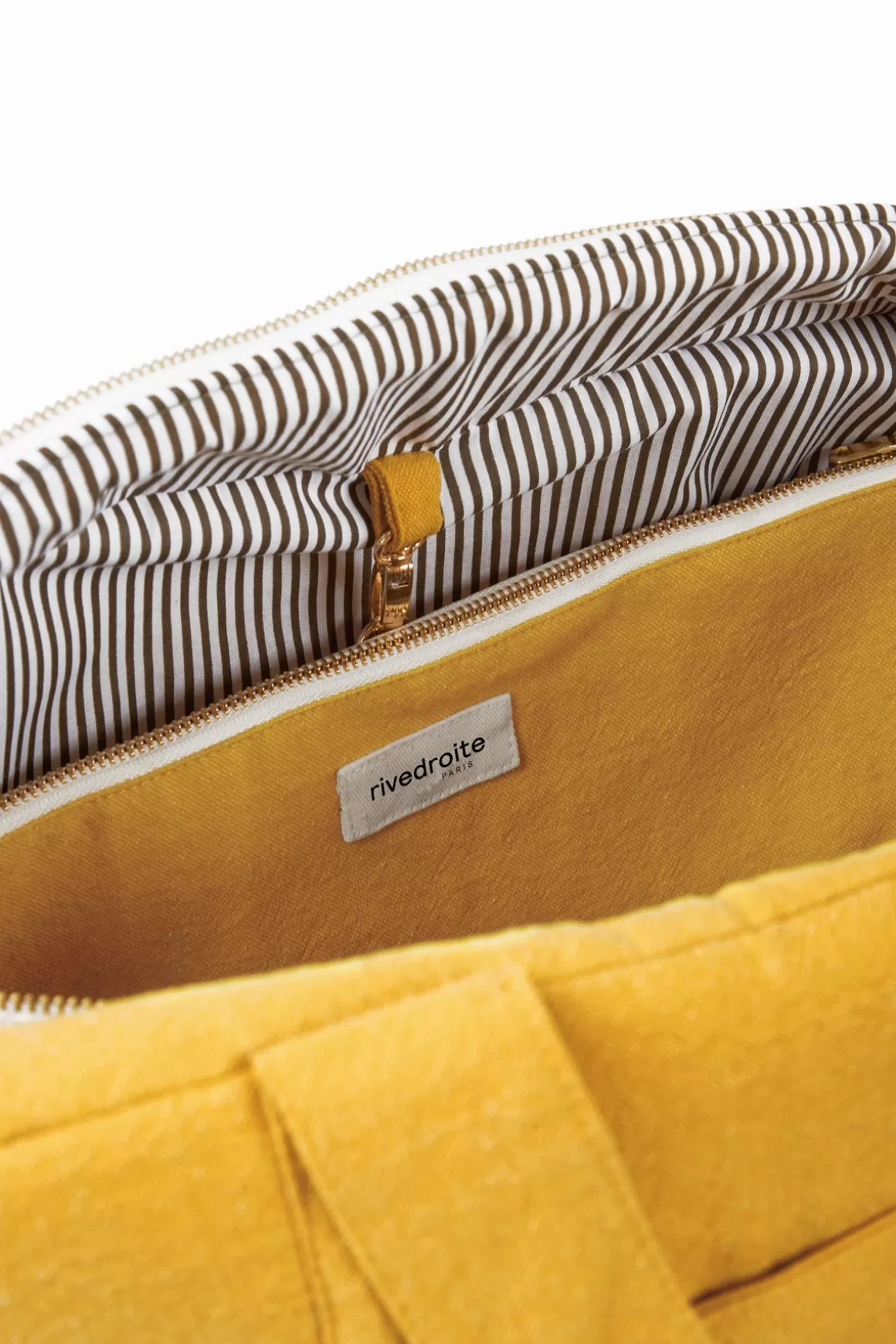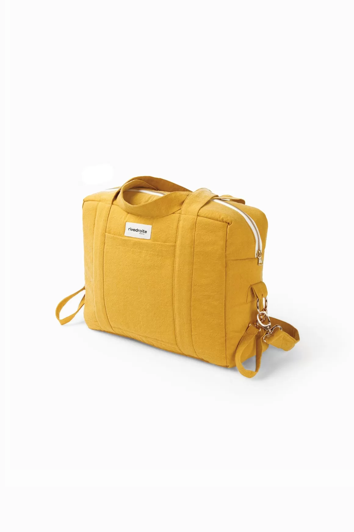 Darcy, the Anti Diaper Bag mustard is a diaper bag that doesn't look like one. You'll love its timeless style and super-practical features, including a large removable pouch, several pockets (a front patch pocket for your phone, an inside pocket for diapers, and an elasticized pocket for a bottle), a loop that slips over your suitcase, and ties for attaching it to a variety of stroller models. The wide, adjustable strap lets you carry it over the shoulder or messenger style. You'll take it everywhere, with or without baby.